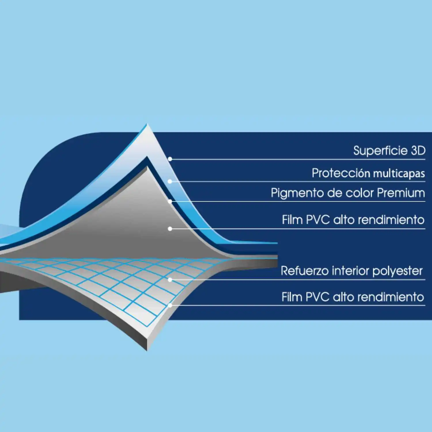 Superficie 3D: La lámina armada para piscina cuenta con un revestimiento que combina la impermeabilización con un diseño texturizado, que crea un relieve tridimensional en la superficie.